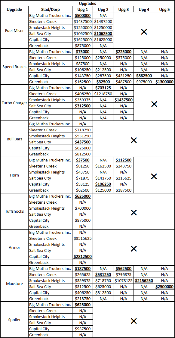 Tabel met alle Upgrades (Alle vetgedrukte bedragen zijn de goedkoopste!) (N/A betekent niet beschikbaar)