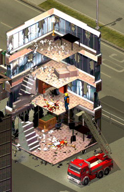 - Zoek rondom het grote gebouw dat in brand staat voor gewonde en doden! Gebruik een K3 Squad!